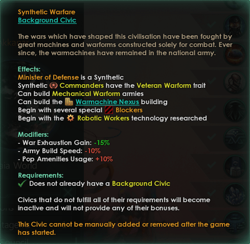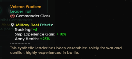 As you begin with a Synth as your Minister of Defense, they also begin with the Veteran Warform trait. Though you cannot hire more Synthetic leaders at game start, once you are able to do so, they will be a great asset in wartime.