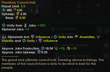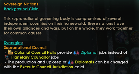 As shown, the player empire instead is able to create Diplomat jobs with the unique buildings provided by the Supranational Council civic. Where normally Planetary Councillor jobs turned Influence OR Unity into amenities, stability and more, Diplomats also produce Unity OR Influence, depending on their upkeep.
